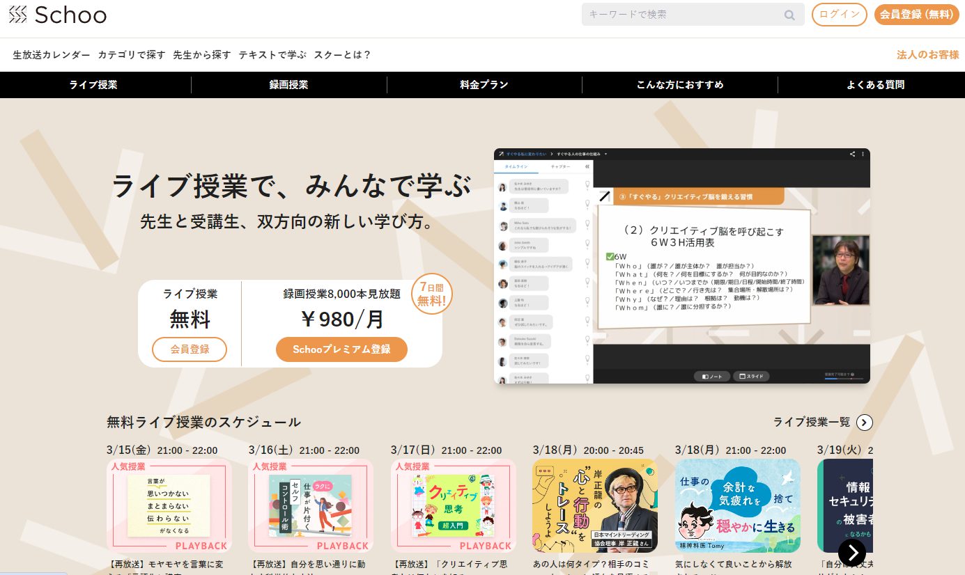 Schooは1年365日、オンラインで学習できる動画授業を配信する無料サービスです。「世の中から卒業をなくす」とのミッションを掲げ、毎日の生放送授業やeラーニングで、身近な学びを提供しています。