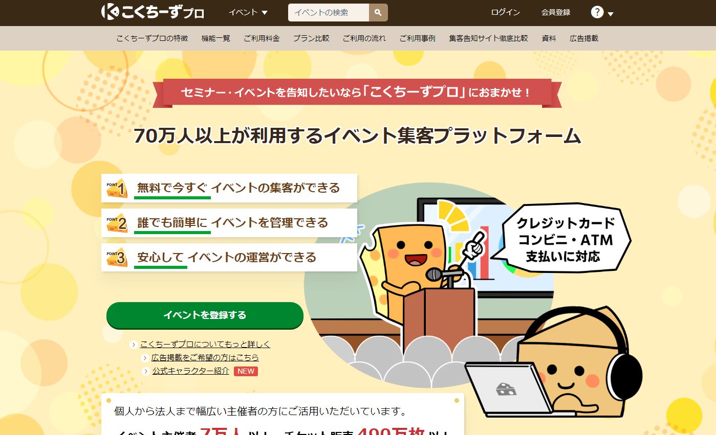 「こくちーずプロ」は、勉強会やセミナーなどの主催者が参加者を募る、利用者数65万人以上のイベント集客プラットフォームです。オンラインだけでなく、会場でのリアルイベントも掲載されています。